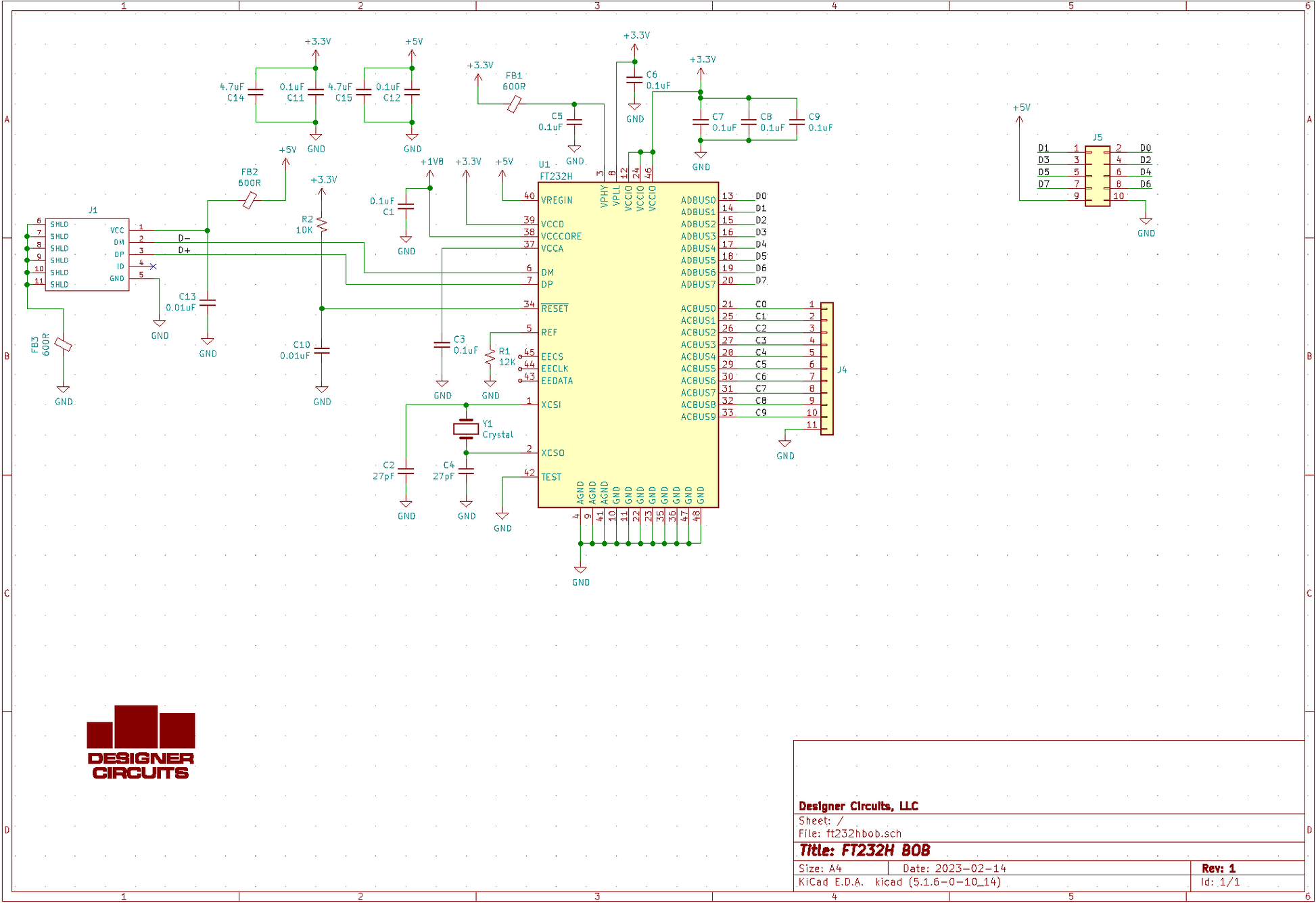FT232H BOB is a breakout board for the FT232H chip from FTDI. It provides all parts on board needed to utilize the FT232 chip from a microUSB port.